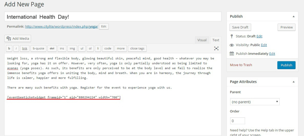 [eventbeeticketwidget frameid=”1″ eid=”880294224″ width=”700″] where ever you wish to place the Eventbee Tickets Widget and click on Publish button.