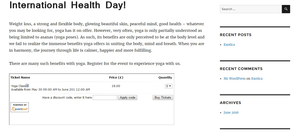 8. After all successful above steps, you can find Eventbee Tickets Widget on your WordPress site.